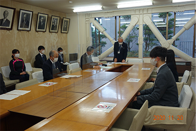 市役所にて激励会。伊東副市長、福間福知山体育協会副会長より激励の言葉をいただき、その後決意表明をおこない記念品を受け取りました。