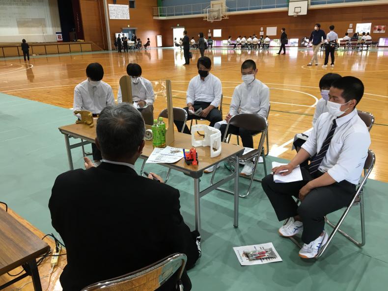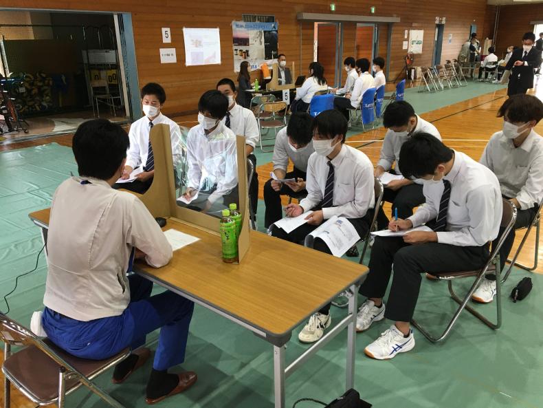 6月1日(水)、「OSADANOジョブフェスタin福知山成美高校」を開催しました。このイベントは、内陸型工業団地としては日本有数の規模を誇る福知山市の長田野工業団地、アネックス三和工業団地の企業12社を本校に招いて企業説明を聞くという就職説明会です。午前中の時間に就職を控えた3年生の生徒60名とともに、1年後を見据えた2年生の情報コースの生徒20名が、30分ずつ計4社の企業の説明を聞きました。生徒からは「説明を聞いて、仕事は連携してやるものだと分かった」「会社の福利厚生がとても大切と分かった。どんなに有名企業でもそこにいる従業員が大切だから・・・」などの感想が寄せられました。情報コースのキャリアプラス課外授業の一環として初めての開催でしたが、今後も実践的な学習の取り組みを継続拡大させていきます。