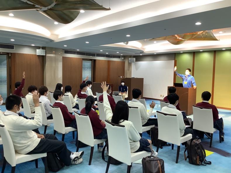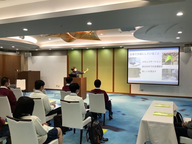 10月7日(金)、「キャリアプラス課外授業テーマパーク研修」と題し、職業教育の一環として城崎マリンワールドに行きました。最初に隣接するホテル金波楼で、人事部の今津さんより企業説明や企業として求める人材の話を聞きました。次に飼育員の山口さんより、飼育員の1日の仕事の流れや仕事内容、仕事の大変なことや仕事で大切にしていることの話を聞きました。マリンワールドの皆さんは「水族館以上、であること」の企業テーマのもと、“思い出作りのお手伝い” “動物と一緒にお客様に笑顔を届ける”ことを大切にされていました。また、サービス業としての気配りやお客様の動線を考えることなど、お客さんが安全に楽しんで過ごすことができるようにと、働く裏側の話も聞くことができました。その後3時間の自主研修を挟み、最後はみんなでイルカアシカショーを見学。先ほどお話を聞いた飼育員の山口さんが出演されていて、最高の笑顔で動物たちとショーを届ける姿に感動しました。ショーの後は、山口さんとイルカたちを挟んで記念撮影。本当に「水族館以上」の体験をさせて頂いた素晴らしい思い出に残る課外授業となりました。今津さん、山口さん、本当にありがとうございました!