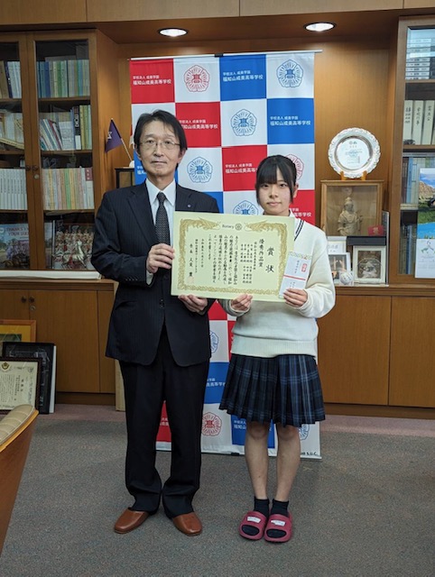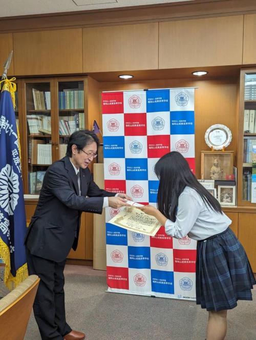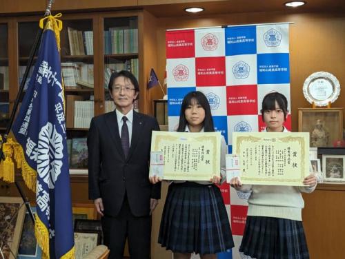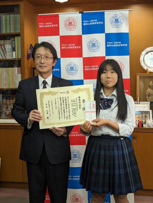 2023/07/06(昨日) 福知山市西南ロータリークラブの会長人見豊さん、実行委員長菊田 学美さん、事業担当下川 和馬さんがご来校され、生徒の表彰をしていただきました。