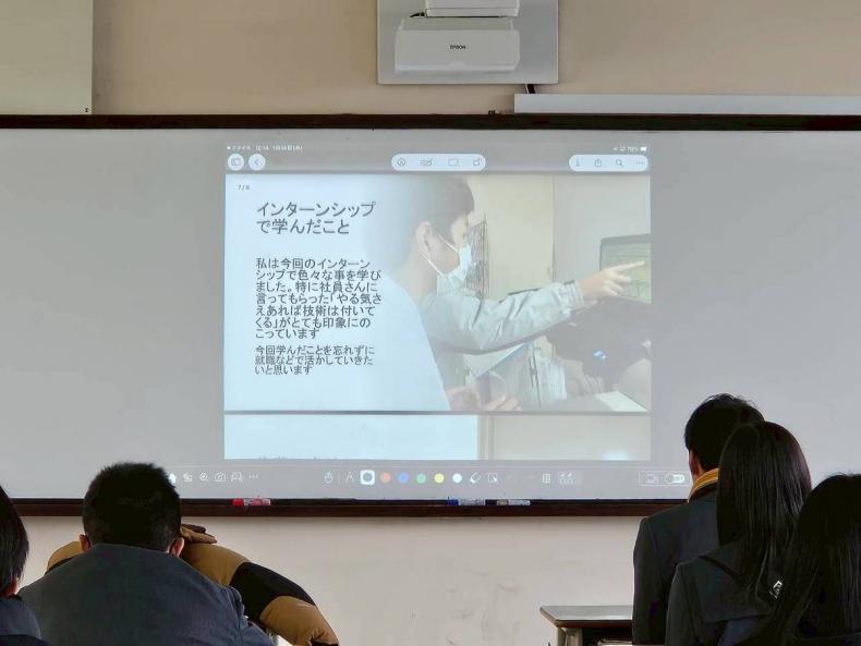 2年生は、インターンシップでの体験をもとに発表を行いました。実際の職場で求められる責任感や、仕事のやりがい・難しさについて具体的に語る姿から、社会と向き合う意識の高まりが伝わってきました。商業科ならではの「現場で学ぶ力」がしっかりと身についていく様子がうかがえました。