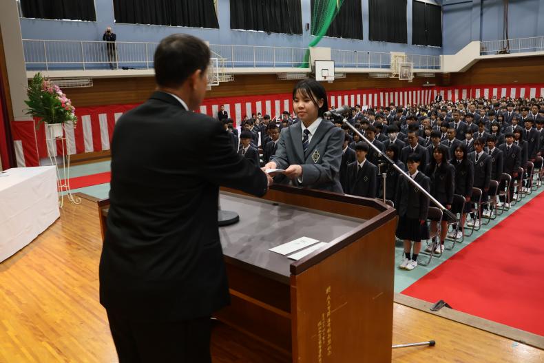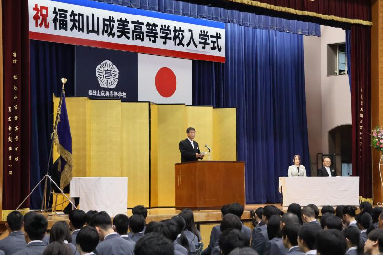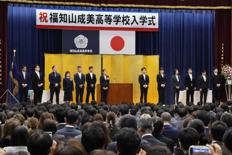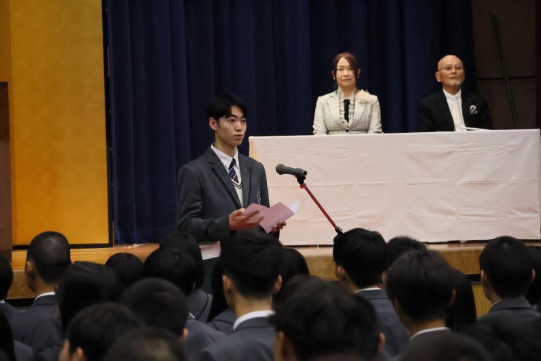 式では、学校長の式辞、理事長の告示に続き、同窓会長・育友会長から温かい祝辞が贈られ、新入生の門出を祝いました。続いて、在校生代表として生徒会長の野口和樹君が歓迎の言葉を述べ、新入生代表の中島真琴さん(桃映中学校出身)が「本校の生徒としての自覚と誇りを持ち、互いに励まし合いながら、実りある高校生活を送ることを誓います」と力強く宣誓しました。