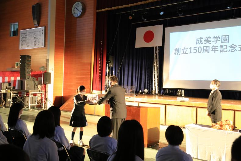 最後に学園から全校生徒に記念品が贈呈され、生徒会長の平田恋奈さんが謝辞を述べました。