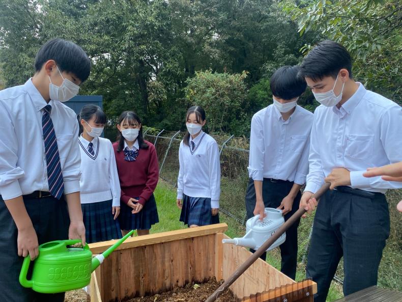 本校は福知山市のSDGsパートナーの認定を受けており、国際コースの生徒を中心に様々な取り組みを行っています。国際コースにはアフリカやアジアの途上国から来た留学生も在籍していますが、彼らは一様に「日本の食の豊かさを思い知った」と驚ろくと共に「日本の食糧廃棄」について疑問を持っています。そんな留学生との交流から、国際コース1年生の生徒6人が、「持続可能な社会のために、自分たちにできることを」と食品ロス対策に取り組み、昨年10月から校内に堆肥箱を設置し、学校食堂の生ごみを利用して堆肥作りを始めました。