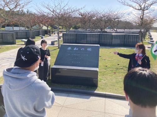 40分遅れで離陸した飛行機も無事到着し、ソーキそばとサーターアンダーギーのお昼ご飯を食べました。その後、沖縄県立平和記念公園で平和学習に取り組み、命の大切さを学びました。