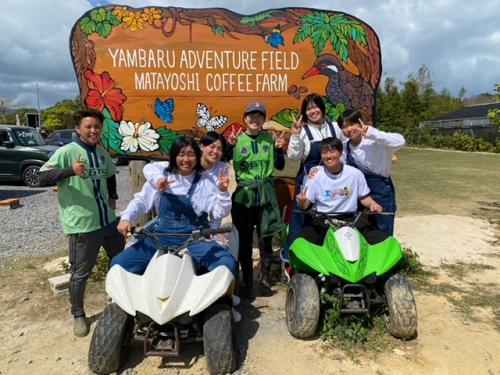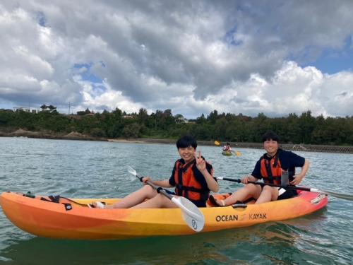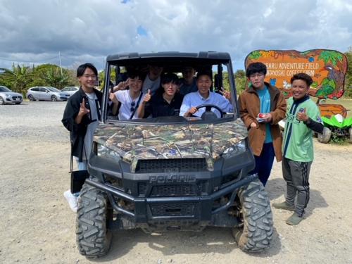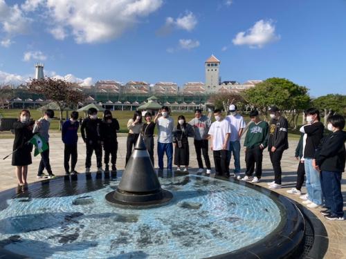 午前はプランごとに分かれてマングローブカヌー、古宇利島観光、ジップライン、イルカとのふれあいとシーサー作りを体験しました。午後からはアメリカンビレッジに移動し班別行動を楽しみました。