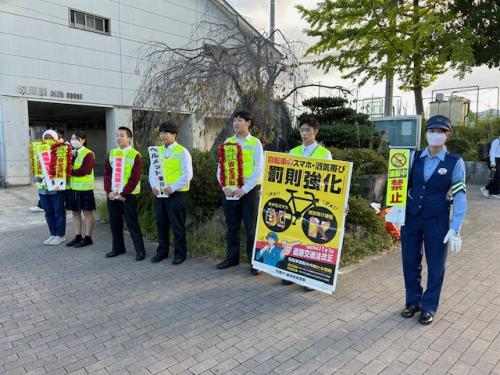 10月25日(金)早朝より、福知山警察署員、地域の交通指導員の方々と、京都府自転車安全利用推進員の講習を受けて推進員となった本校生徒(剣道部有志)が協力してプラカードを持ち、「ながらスマホ」の禁止や自転車を安全に乗るための啓発活動、自転車の鍵かけの呼びかけ等に取り組みました。