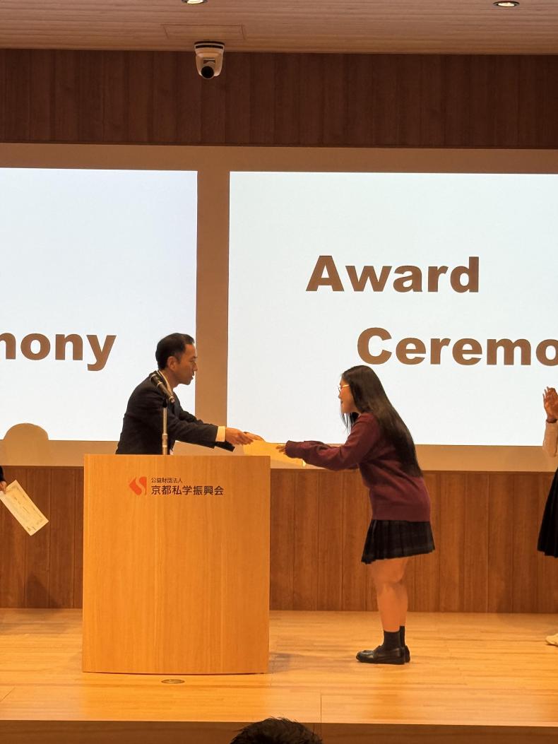 10月11日、京都市内の京都私学会館で開催された「第18回京都府高等学校英語スピーチコンテスト」において、国際コース3年9組の井上愛那さんが見事優勝を果たしました。