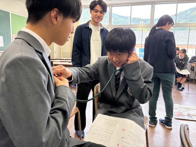 また、「京大医学部生と交流・実験」では、「AEDの使用体験」や「聴診器による脈拍測定」などに取り組み、医療分野への理解を深めました。