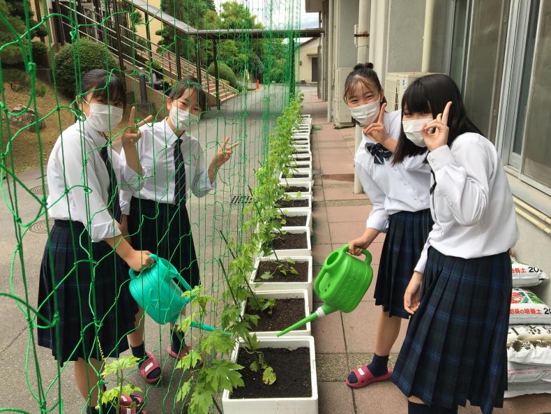 6月21日、1年10組国際コースの生徒が、SDGs(持続可能な開発目標)についての学習の一環として、「緑のカーテン」作りに取り組みました。本校は福知山市の「SDGsパートナー認定」を受けていますが、この日は、「緑のカーテン」を推進している福知山環境会議から3人を招いて行いました。ゴーヤを育てつつ、この取り組みによって冷却効果やエアコンの使用回数が減るかなどを調べ、脱炭素社会の実現や地球温暖化防止への意識づけにつなげたいと考えています。また、この結果は今夏に開催される「全国高校生SRサミットFOCUS」に成美の5人が出場し、取り組みについて発表する予定です。