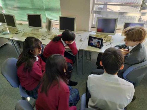 国際コースの1年生が、ハワイにあるパールシティ高校で日本語を学んでいる生徒とオンラインで交流を行いました。互いに自己紹介や質問をしたり、学校生活や互いの住んでいるところについて自由に会話を楽しみました。始まる前は少し緊張していた生徒もいましたが、話してみると同じアニメやアーティストが好きだったり、日本の料理や文化に強い関心があることが分かったりして、すぐに打ち解けて会話に花が咲き、あっという間に時間が過ぎていきました。